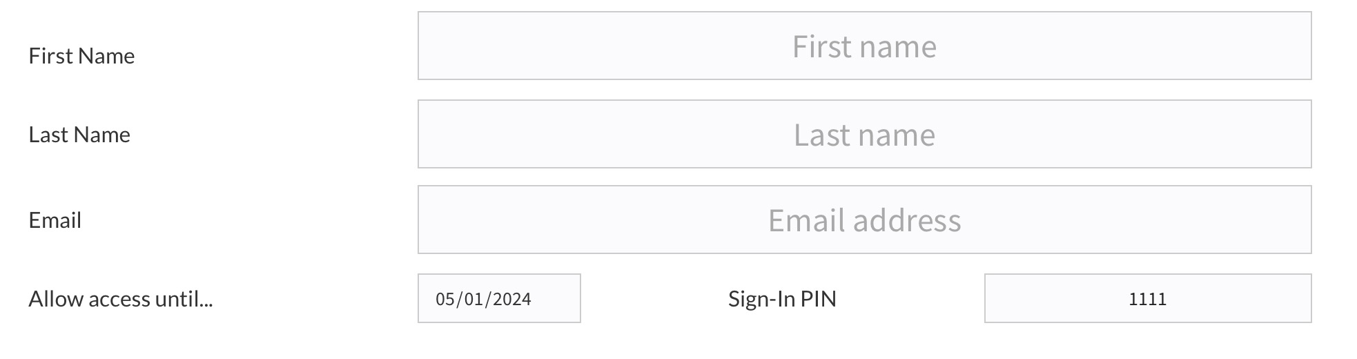 From here, enter the name and email address of the staff member. You should also set an end date for when they will have access to the website. Their first-time sign in PIN can remain the default of 1111 (they will be forced to change it when they first sign in).
