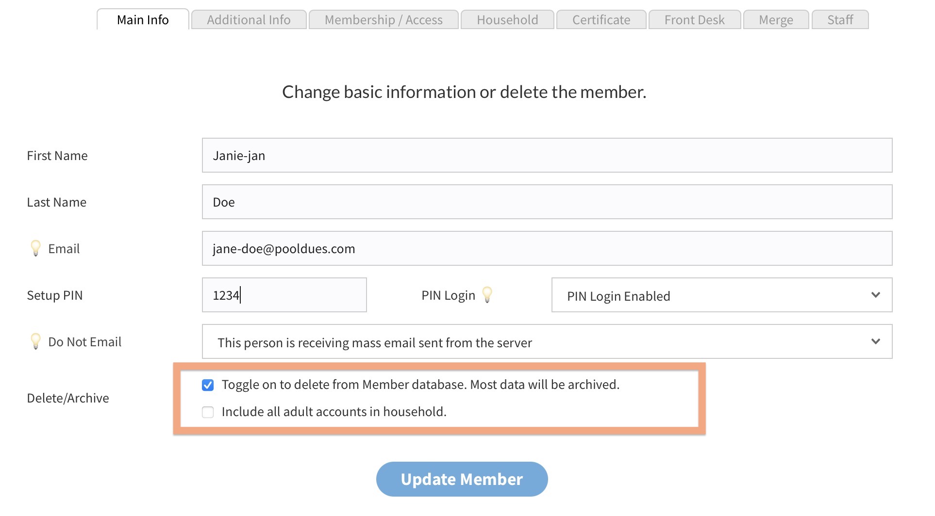 To delete them altogether, in the Main Info tab there is an option to delete / archive their info (highlighted below). Once deleted from the member database they will no longer have any access to the website.