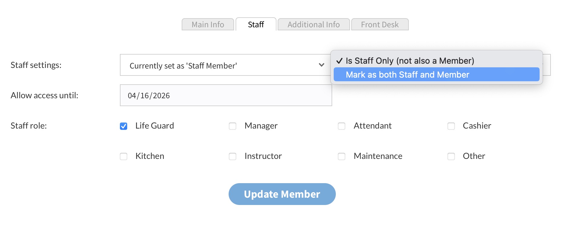 Since member children are very often the staff at swim and tennis clubs, you may not need to create a Staff account if they are already a sub-account of a member household.
