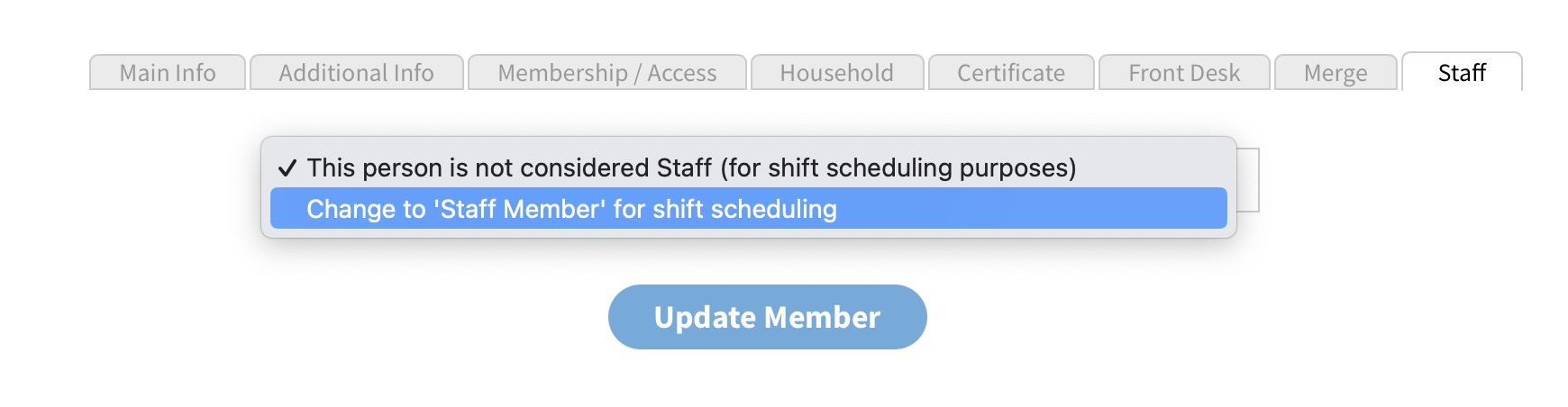 Toggle on “Change to Staff Member for shift scheduling” and hit Update Member. If the person you converted was a head of household (they probably won’t be), you will notice a few tabs have gone away, so you may want to mark this person as both Staff and Member. You can see this option in the screenshot below…