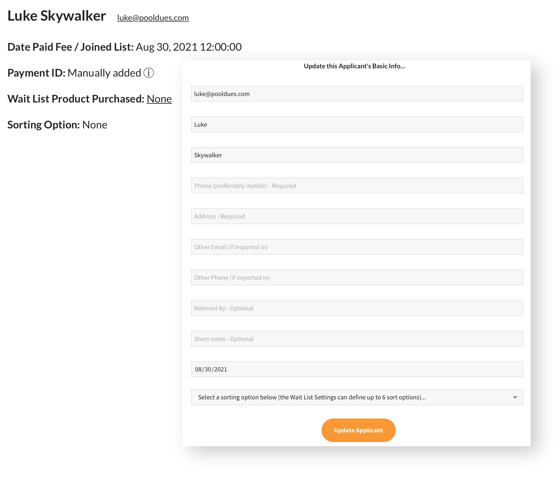 Each applicant’s basic info, like name, email, phone number, address, sorting option, and even the day they were added to the waitlist can be viewed and edited in this first section.