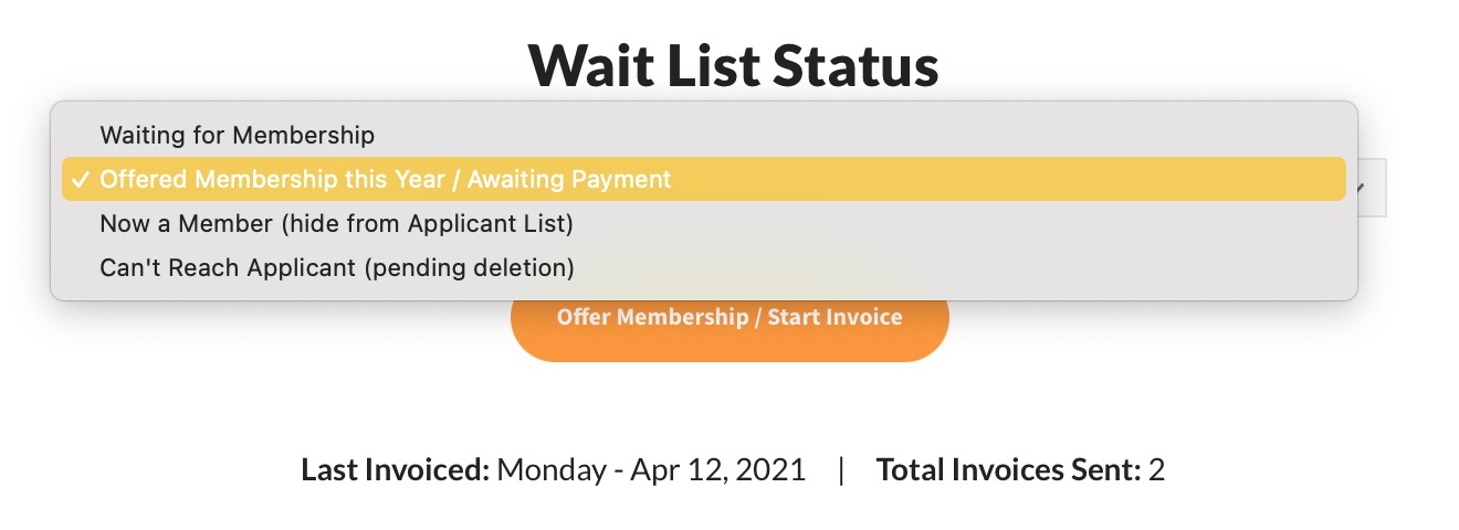 - The applicant status gets updated to Offered Membership this Year / Awaiting payment when you Offer a Membership, ie: Start an Invoice. You will also see more information about the date and number of invoice(s) that have been sent to this applicant here.