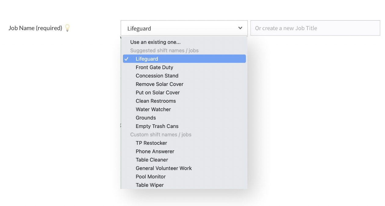 The next screen has a few sections of options to fine tune the shifts that will be created. The first is the Job Name. Select from existing or suggested job titles or create a new job.