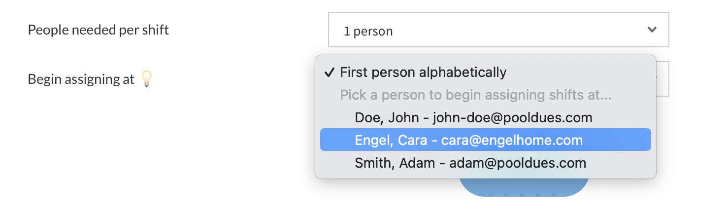 If your shifts will be assigned workers, you can choose which person to begin assigning them to (this will default to alphabetically whoever is first)…