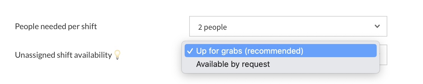 Since your shifts are unassigned, you can choose whether you want potential workers to be able to grab whatever shifts they want or make them available by request. To easily fill your empty shifts, we recommend choosing “Up for grabs”.