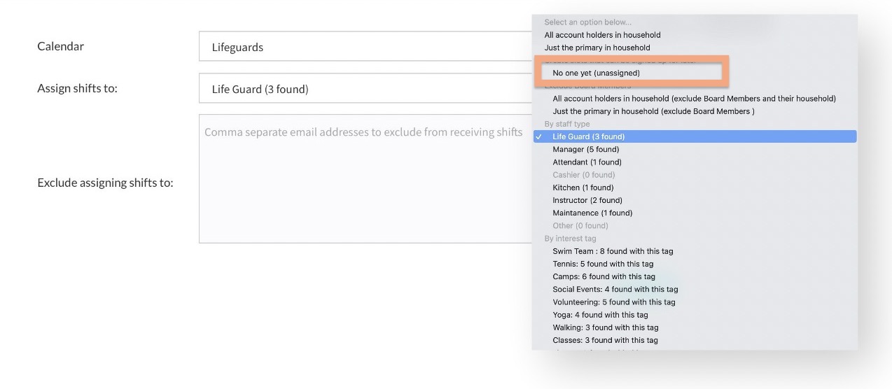 On the first screen you will choose which calendar to assign shifts to and your worker pool, if any. In the screenshot below we have highlighted in orange the option to create unassigned shifts. If you choose to assign shifts to a specific group, for example, “Lifeguards” but you know one person in particular will not be available in the timeframe you are creating shifts for, you can exclude them by entering their email in the bottom field.