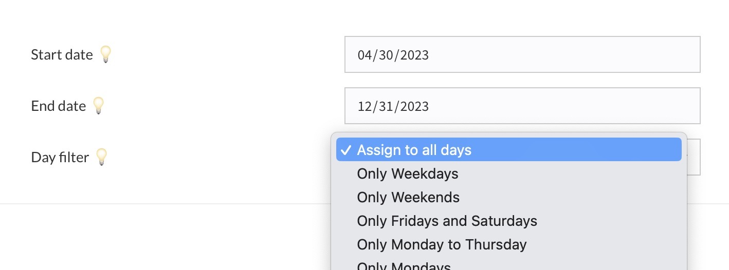 In this section, you will set the first and last date to assign shifts. So for example, you might want to only set shifts in the month of June. You can also filter which days of the week you want to assign shifts to.