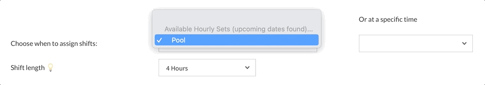 In the next section you will choose the shift length and when to assign the shifts. You can choose to begin creating shifts at the start of a specific day as defined by an Hourly Set (such as Pool Hours) or at a specific time. You can see in the animated image below if you select an hourly set it will disable starting at a specific time and vice versa.