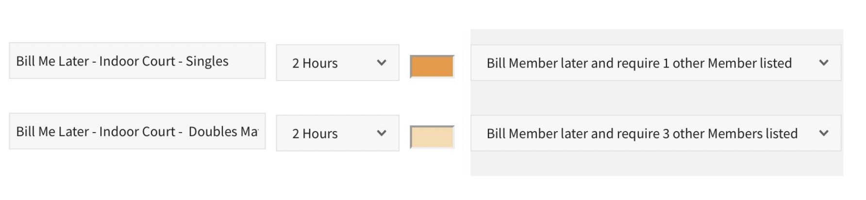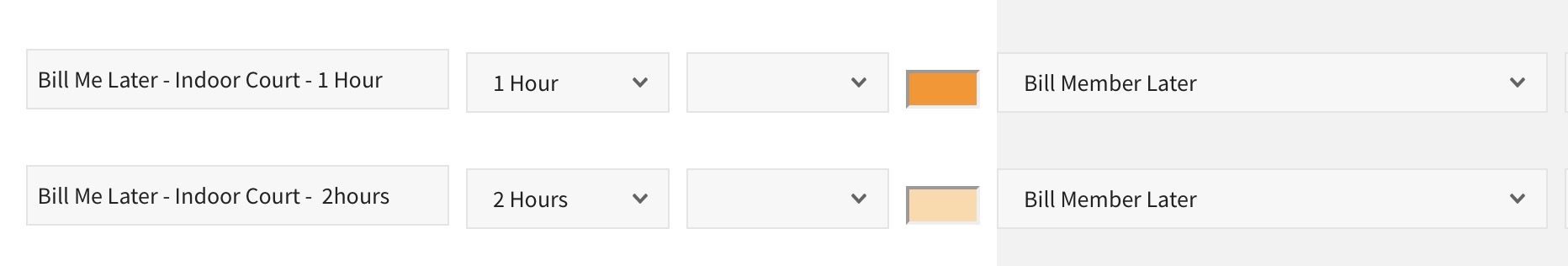 In the example above, the Type’s name is set to “Bill Me Later – Indoor Court – 1 Hour” and this reservation type has a max reservation time of 1 Hour.
