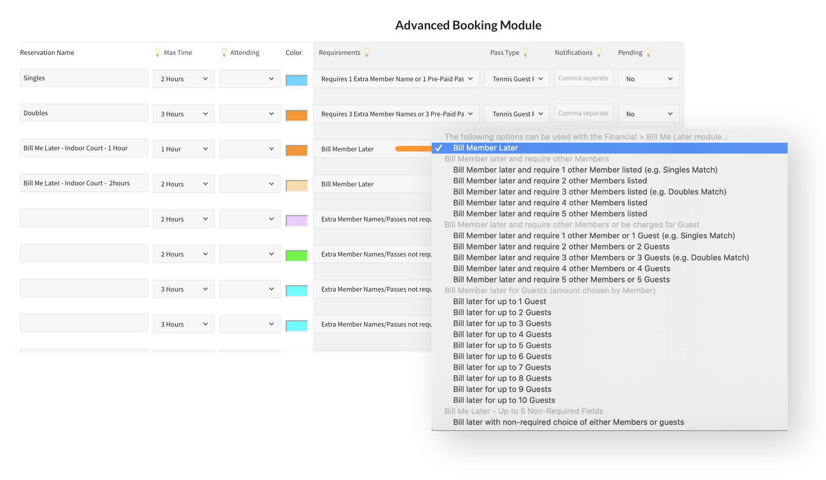 The Advanced Booking Add-On extends any of your grid’s Reservation Type options to include a variety of Bill Member Later options in the Requirements column…