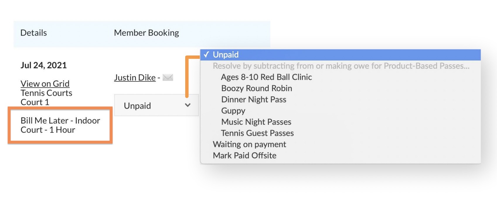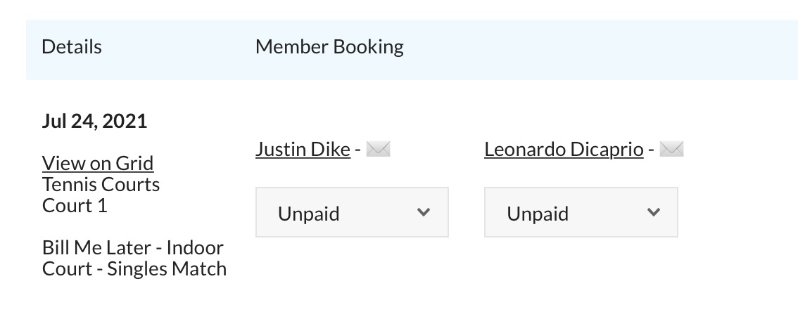 When your Treasurer is viewing the members that have booked courts using the Bill Me Later options, they will be able to see the name and court (or area).