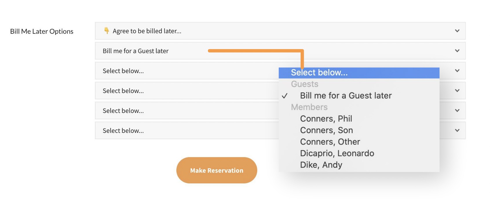 If the Reservation Type is set to Bill Member Later in the Requirements column, the member is not asked to enter another member’s name or specify they are bringing a guest (this is the simplest Bill Member Later option)…
