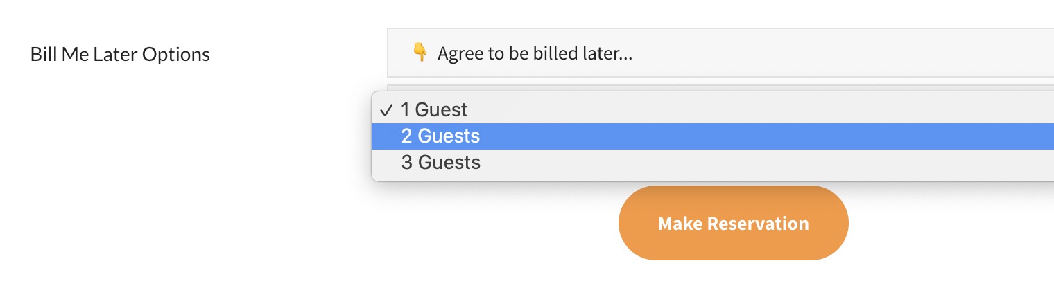 The member will have the flexibility to be able to specify how many guests are coming. For example, the member would see the options below when booking if the Requirement was set to Bill later for up to 3 Guests.