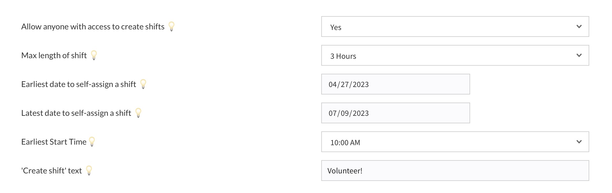 Allow anyone with access to create shifts – Set “yes” to turn this feature on for your calendar. The rest of the settings in this section are ignored if set to “no”.