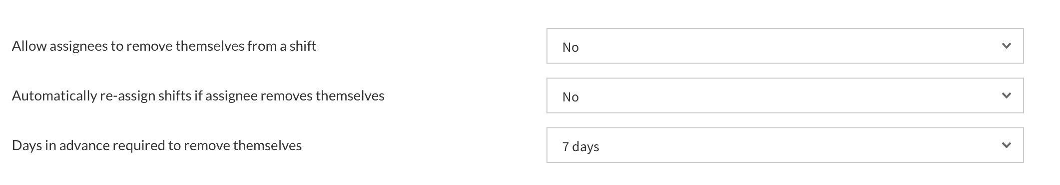 Days in advance required to remove themselves – For example, if the number is 7 days, then the shift assignee can not remove themselves within a week of the shift date.