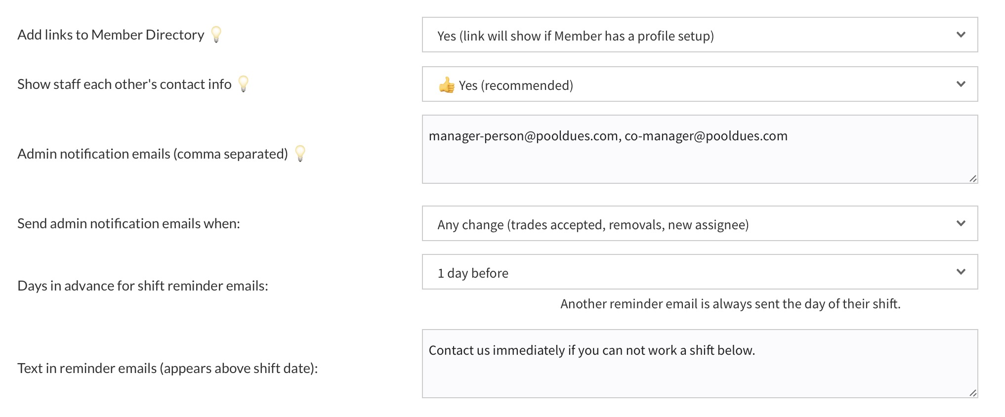 Days in advance for shift reminder emails – This is the number of days before a shift to remind an assignee. For staff calendars you probably want to set this to 1 day (ie “Tomorrow you have a shift”). For volunteer calendars you may want to remind people a little further in advance in case they forgot they signed up to do something.