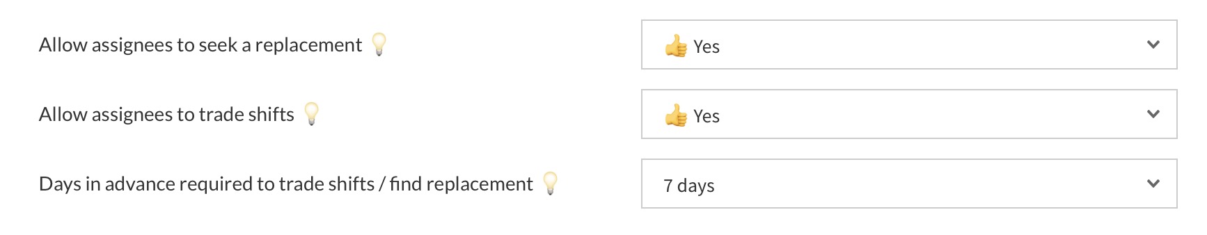 These settings allow shift assignees to mark their shift as willing to trade or seeking a replacement. These statuses do not get the original assignee out of working. Their shift is still considered covered by them unless a trade is made or someone takes their shift. Assignees are emailed whenever a change occurs.