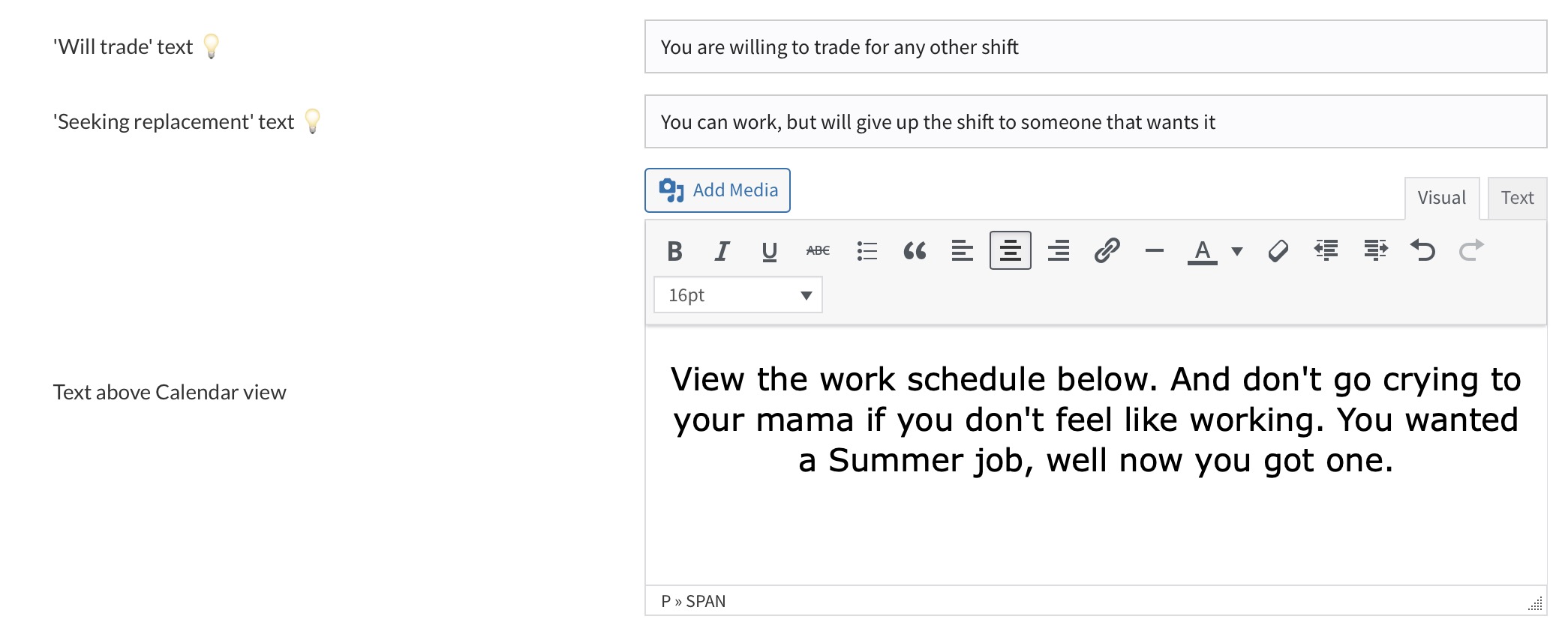 Text in reminder emails – This text appears in reminder emails to assignees above their shift details (job name, date and time). For example, you probably want something like, “Contact us immediately if you can not work a shift below.”