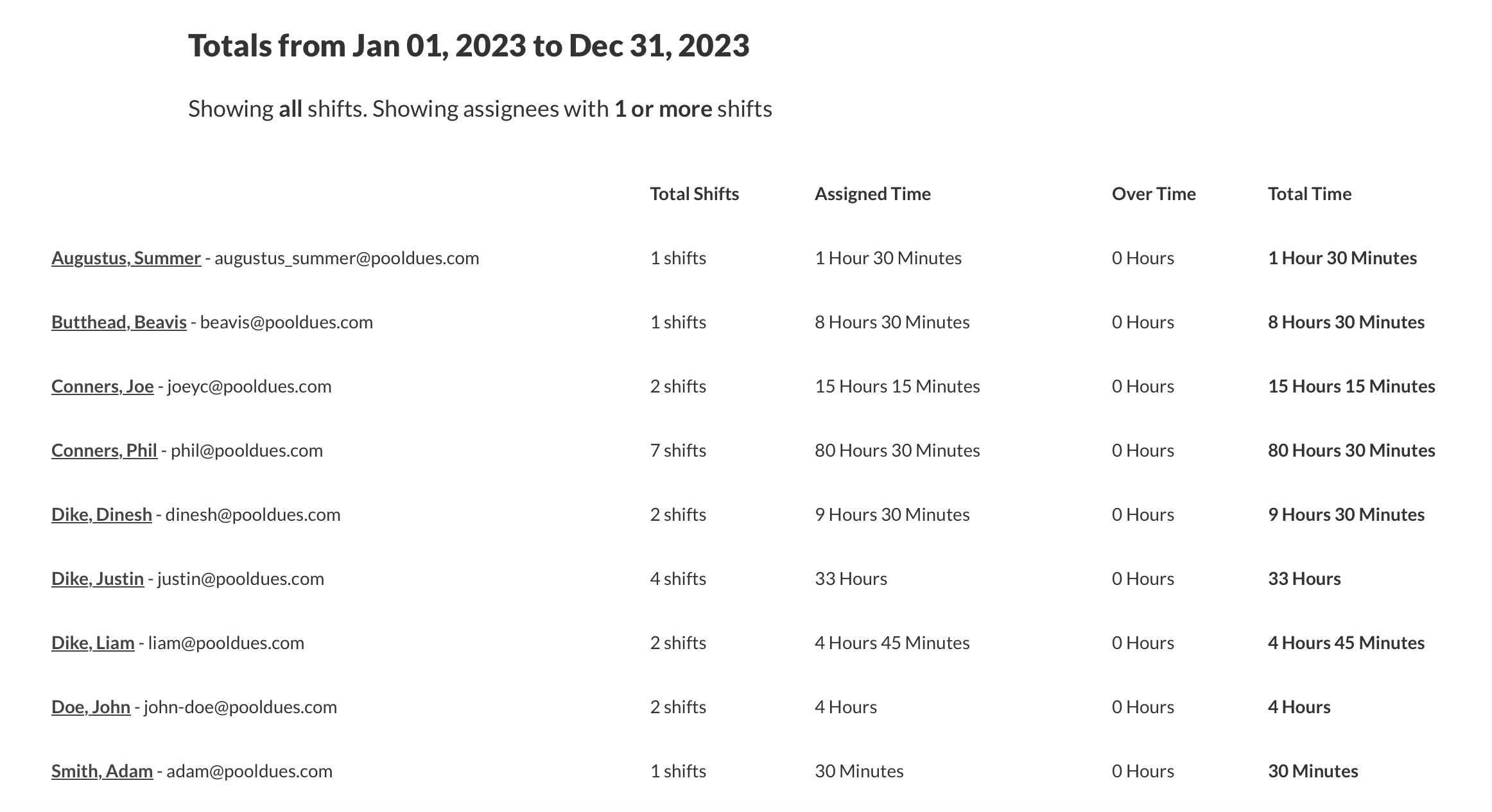 The Shifts Total page will list every assignee that had shifts during the date range you set. So you will see something like this…