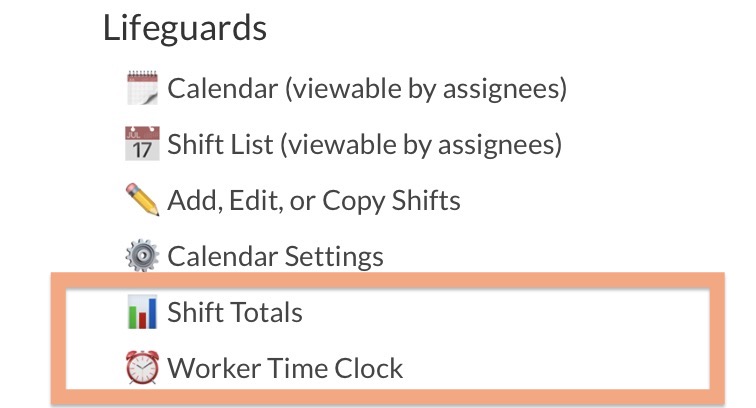 From the main Shifts Dashboard you will find links under each calendar that go to a Shifts Total page and Worker Time Clock.