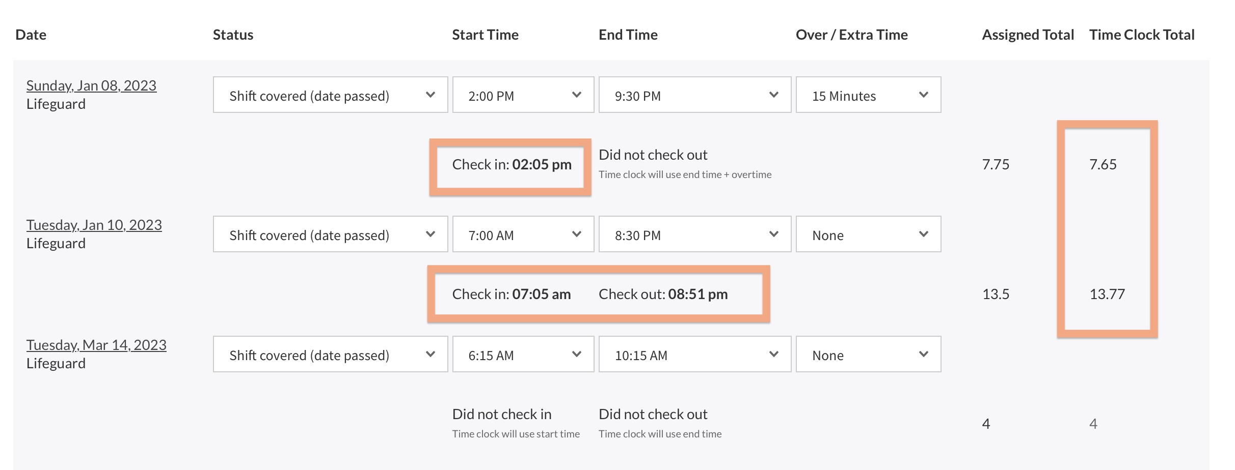 On each date, you can see the Start Time, End Time, Over/Extra Time and Total Assigned Time. If need be you can also adjust those times or change the shift status (including removing a shift altogether).