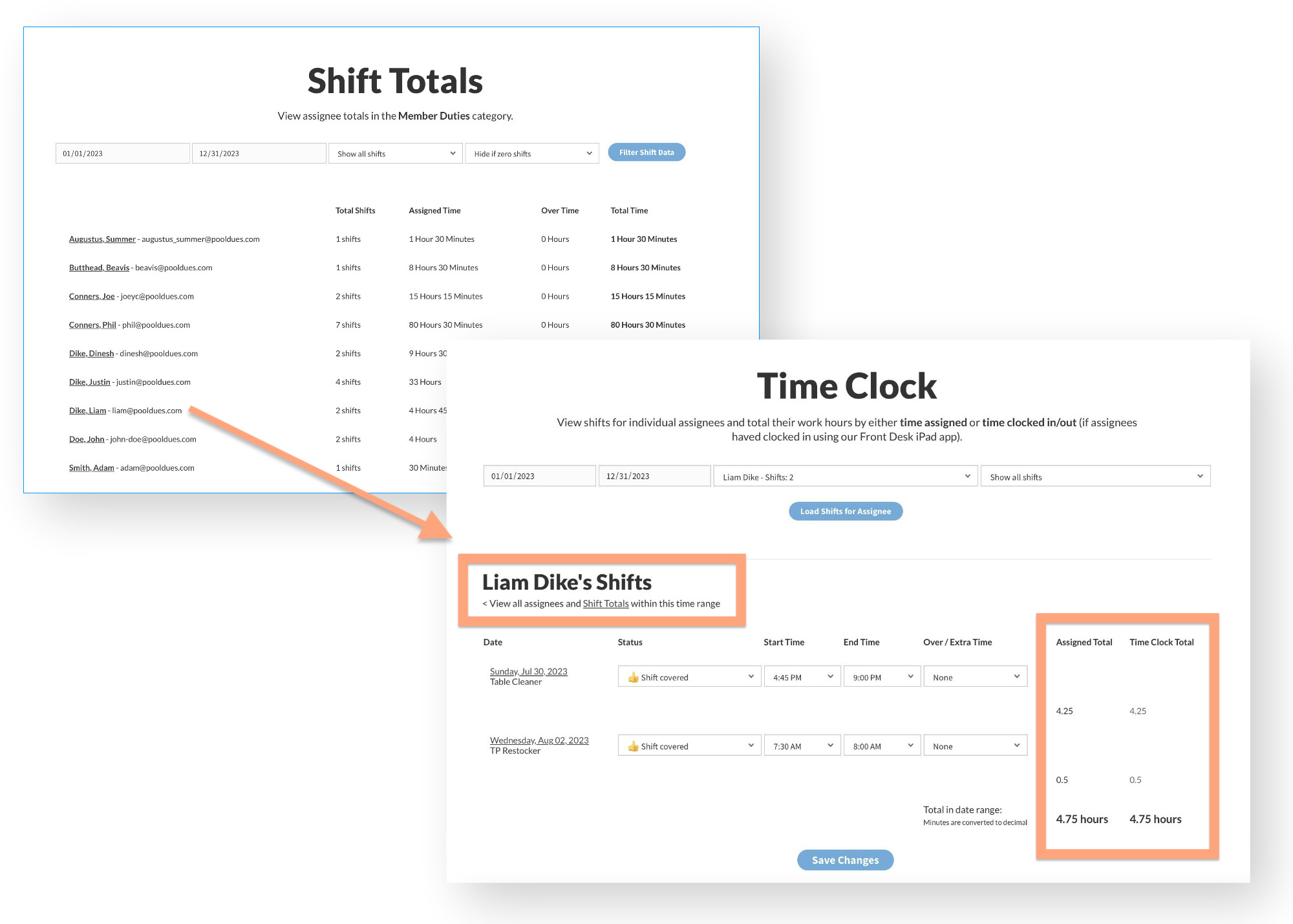 In the screenshots below, you can see if we click a worker’s name it will jump to the Time Clock page for that individual. These pages are filterable to specific date ranges, for example, you might want to only see shifts from June 1 – June 15.