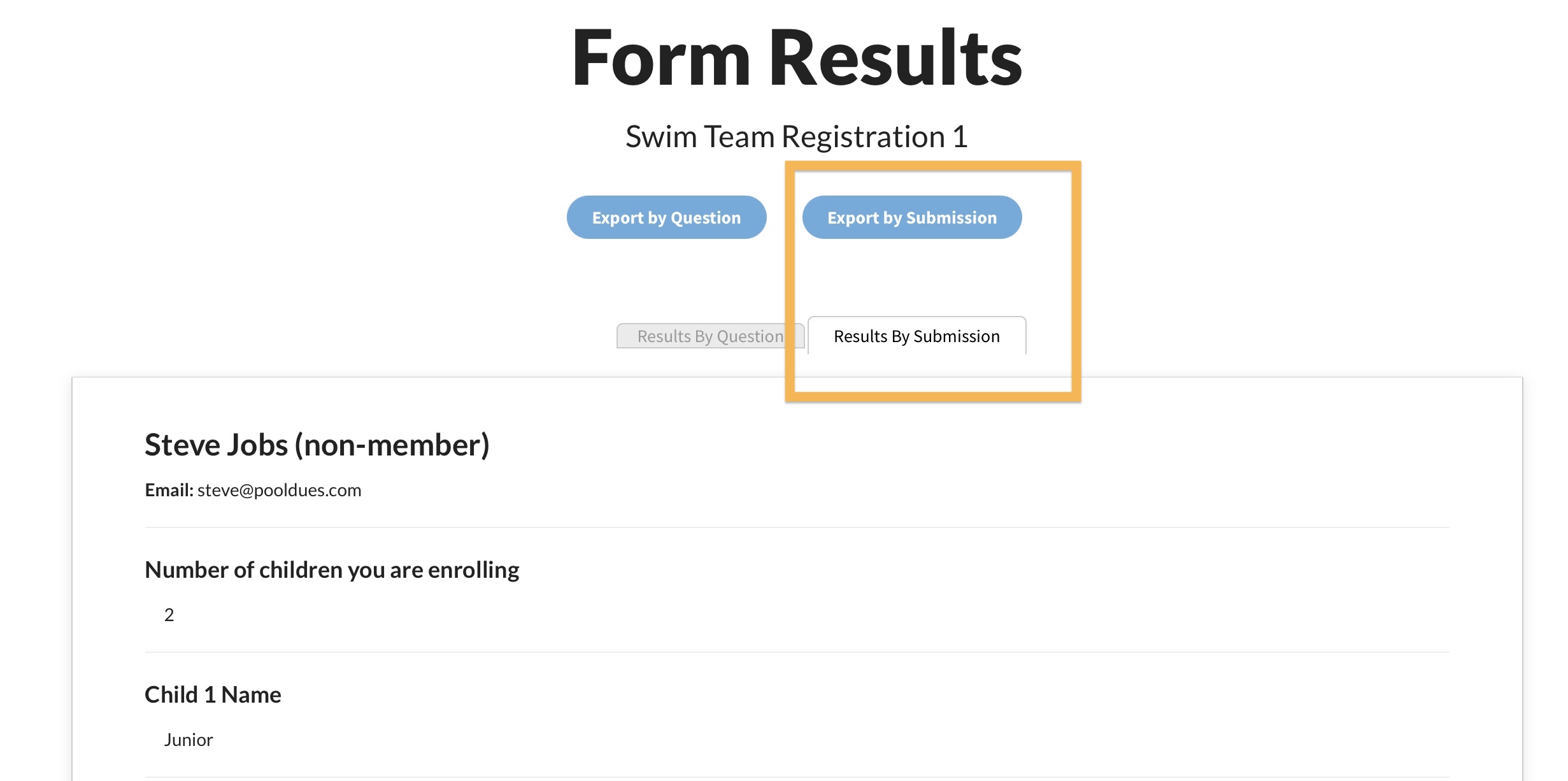 Choose how you want to view the results. You can also export out the information to a CSV, which looks like this when exporting Results By Submission…