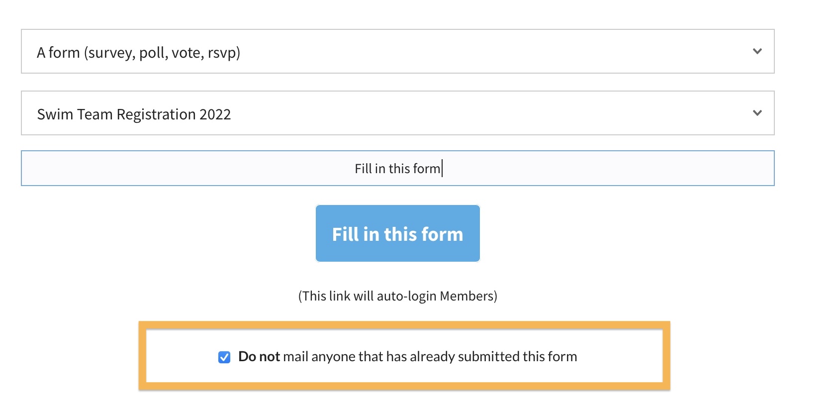 Since you are reminding buyers to provide followup info, you will only want to sent to people that have not filled in the form. Below the Body Message of your email, choose similar options to the screenshot below. Add a button to the Form, then toggle on “Do not mail anyone that has already submitted this form”.