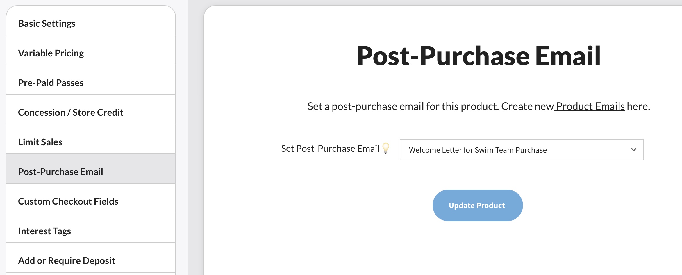 Select the Post Purchase Email tab, then set the Product Email you created (choose the reference name from the pulldown).