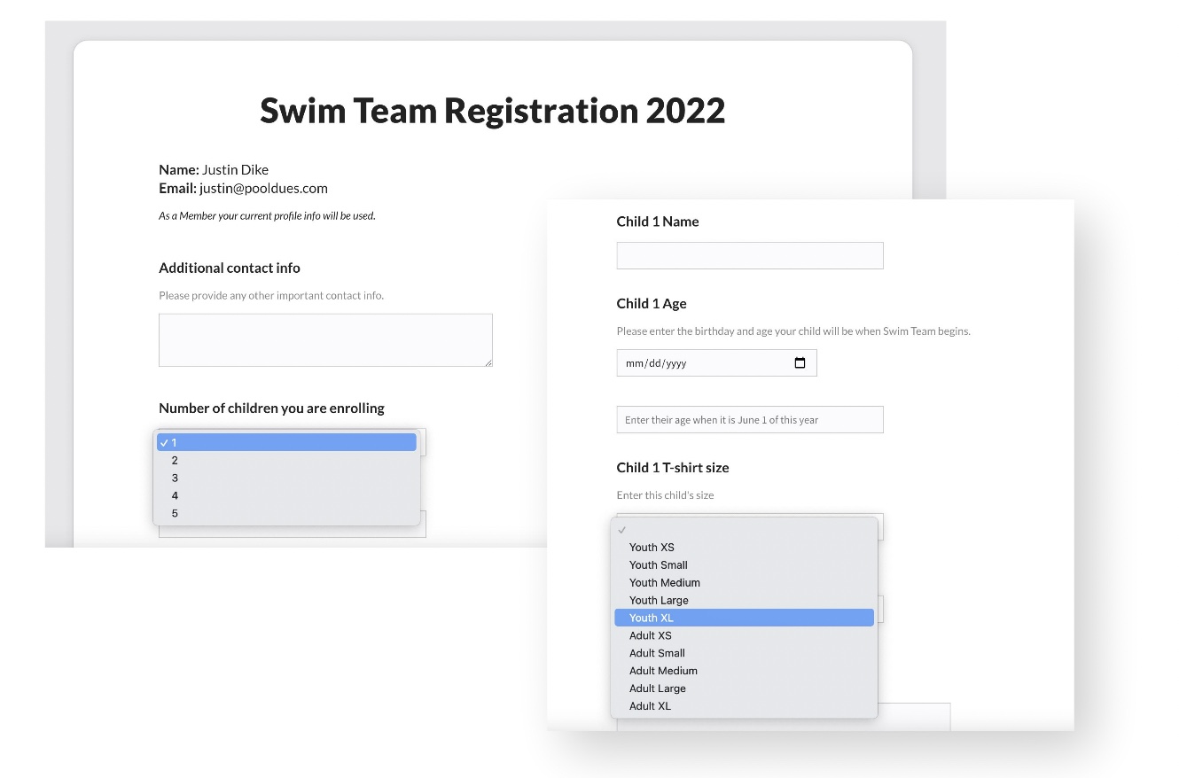 For a camp or team registration, we recommend starting with one of our templates, which are already setup to collect info on multiple children. The image below will give you an idea of what the form will look like to buyers…