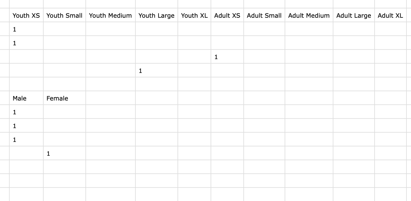 Exporting Results by Question can help you break out totals for specific questions in a spreadsheet friendly way. For example in the screenshot below, your team rep could easily total up all the T-shirt size and Gender columns.