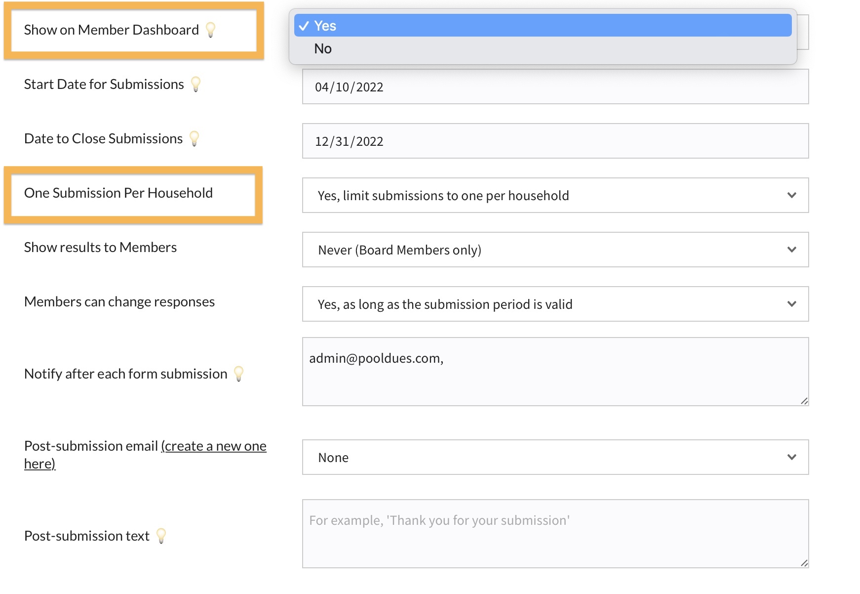 Most likely you will want to set One Submission per Household to “Yes”, so you do not have duplicate entries if both spouses were to fill out the form.