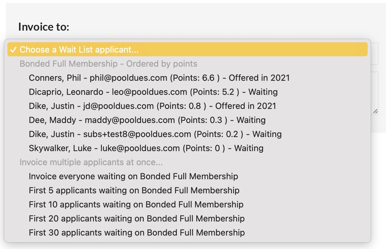 The rest of this process should be pretty familiar to you at this point, but you can read more about sending invoices in general here. One main difference with invoicing your wait list specifically will be the options available for whom to send invoices to. Send to one applicant, the entire list, only a certain list, or only the top 5, 10, 20, etc…