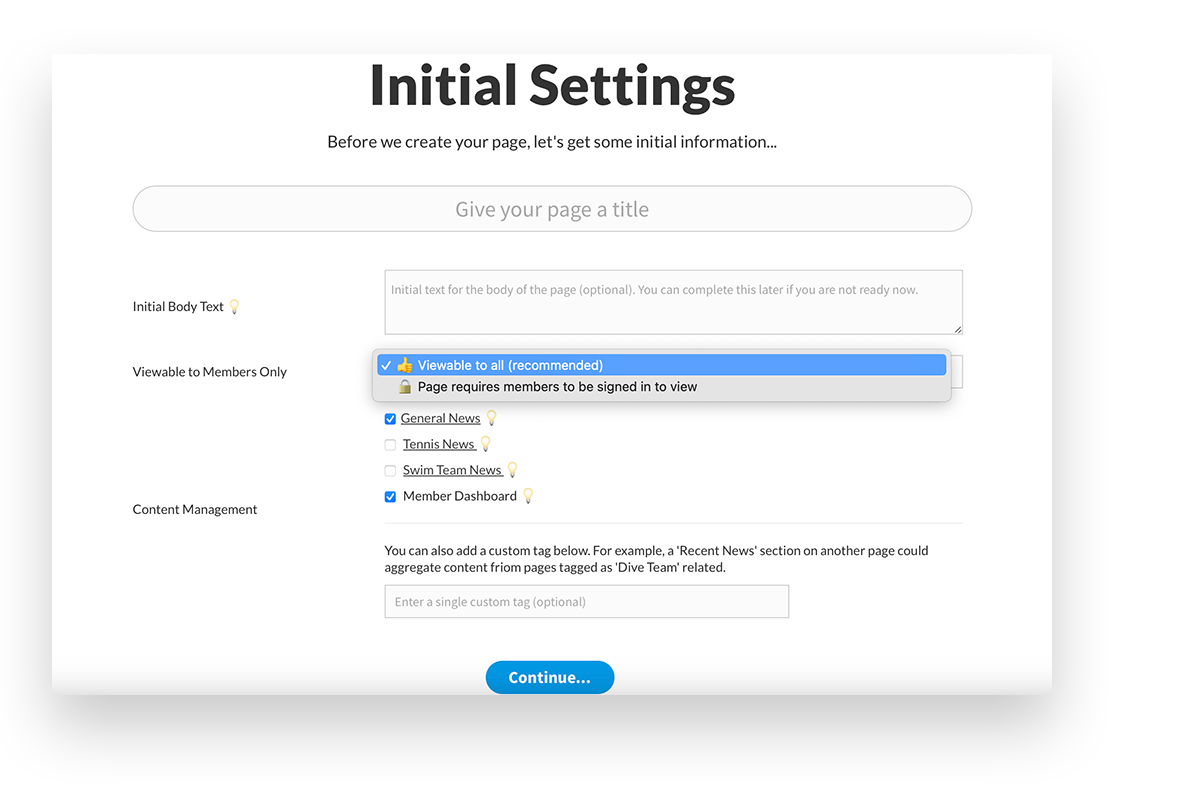 Otherwise known as Content Management Settings (CMS), these are the settings that determine where your new page shows up on your website and who can access it. Based on the type of template you choose, these options may vary slightly but the basic settings will remain the same. In the example below, we have chosen the General Info/News Template.