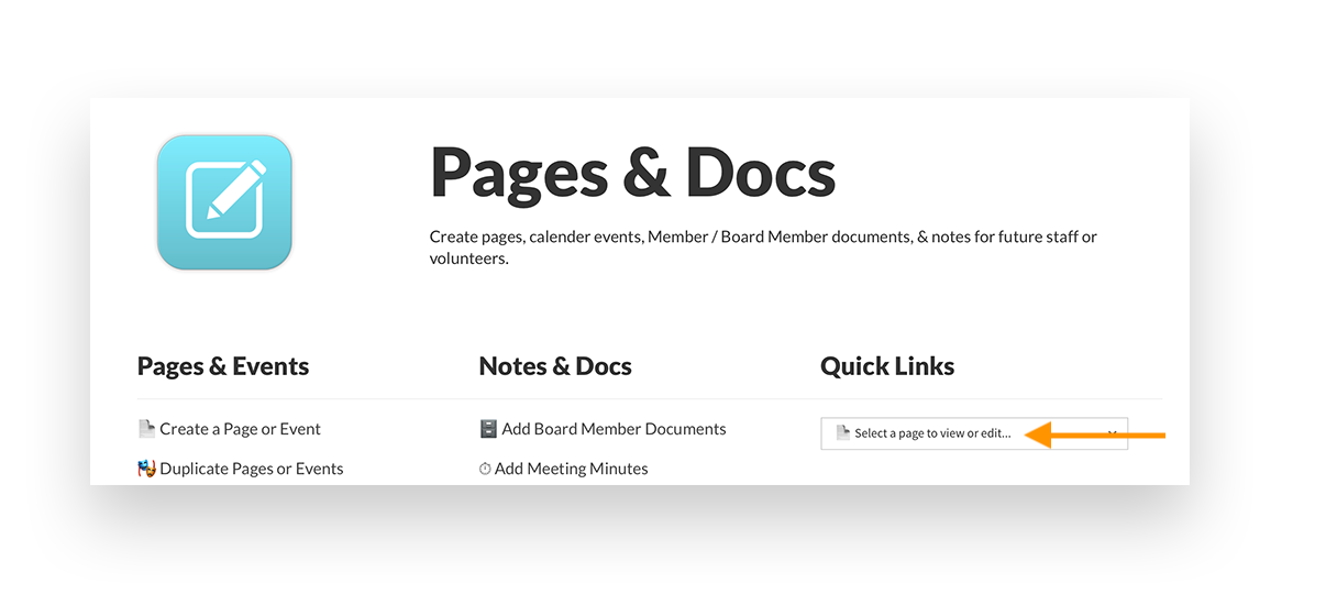 On your Board Member Dashboard > look for the Pages & Docs icon > Under the Pages & Events section, you will find the Create a Page or Event link.