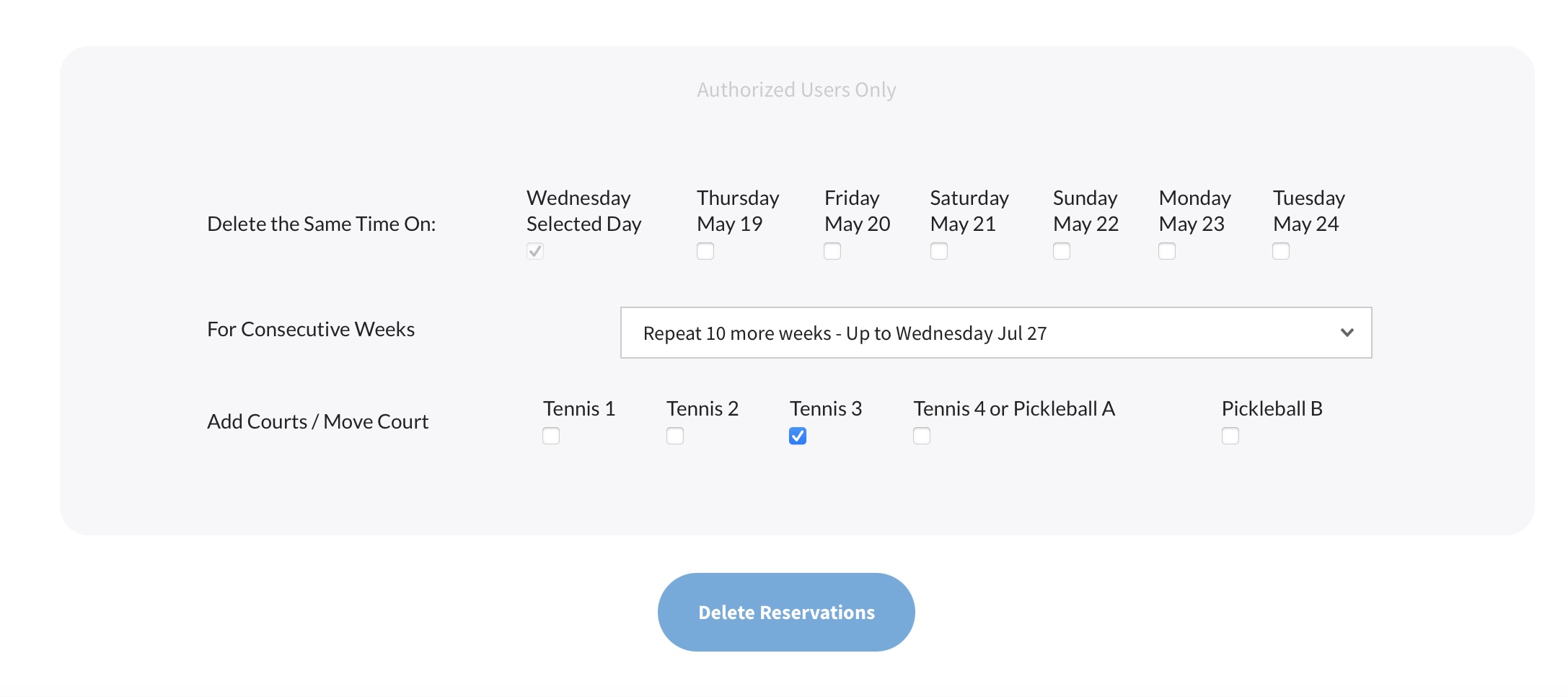 Finally, select the number of weeks / days / areas you would like to delete reservations from (likely you will be choosing the same options that were selected when creating your initial repeating reservation).