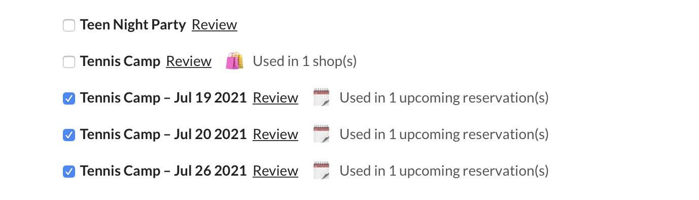 Multiple products can be deleted at once from here. If they are used in any of your shops or reservation grids you will see notes next to each product, like so…
