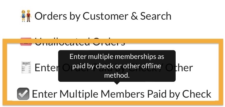 In the Financial Dashboard under the Orders & Products section, use the Enter Multiple Members Paid by Check link to quickly create manual orders for existing households renewing their membership.