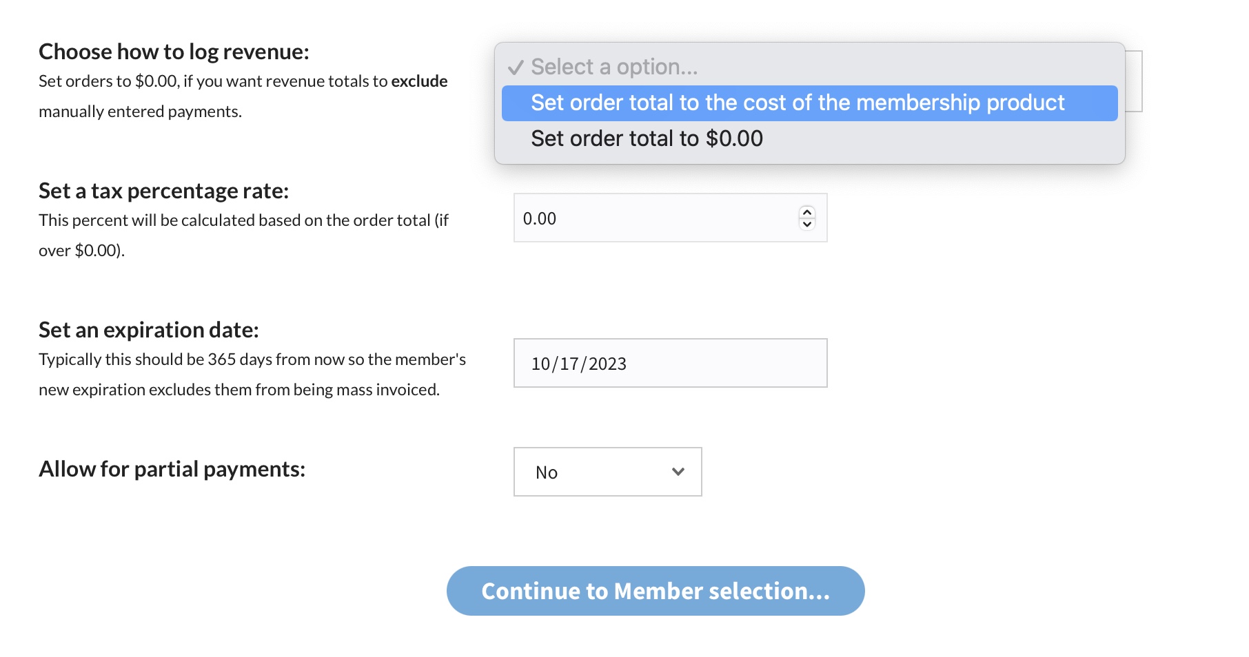 Before selecting which households you want to renew, this module will first ask for a few settings that will be applied to the orders that will eventually be created. Each order will be logged as “Entered Manually” so they can be noted separately from orders paid for directly through the website.