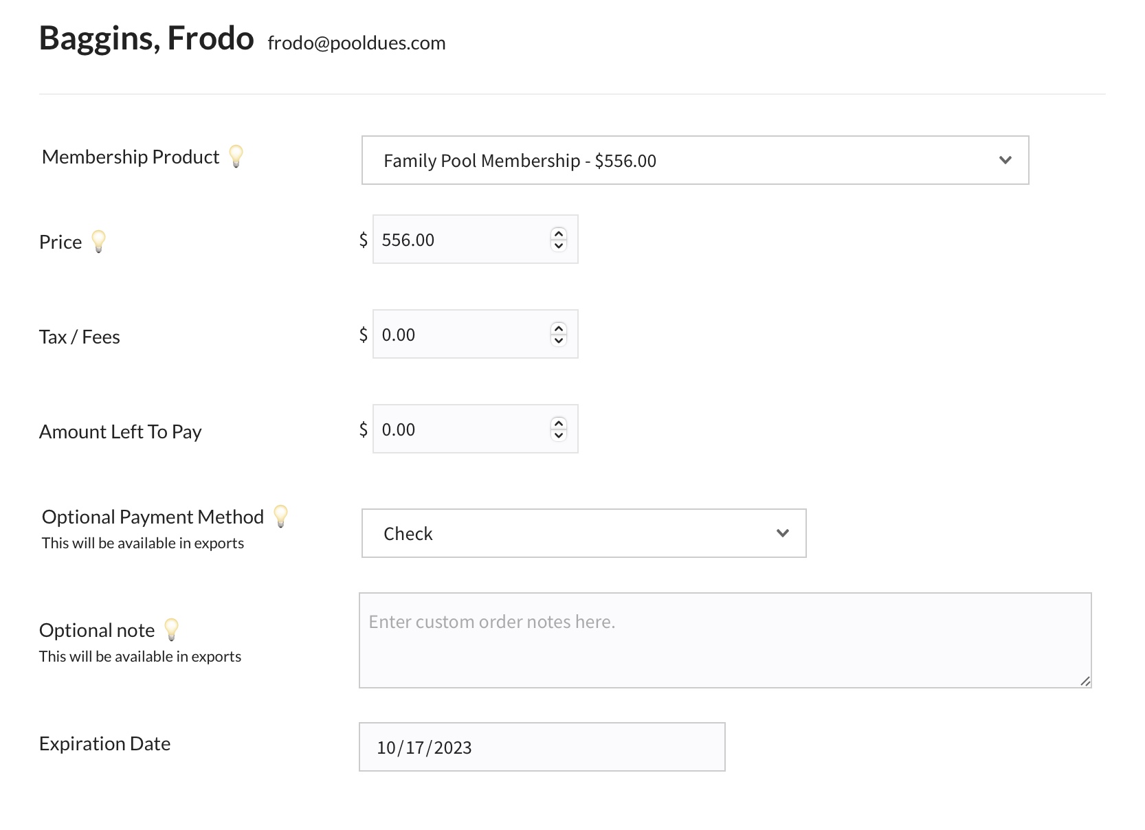 You also have the option to change the membership product the household is paying for. So for example, if the household was previously paired up with the product titled “Couples Pool Membership” but is paying for the “Family Pool Membership” you can make that last minute change here.