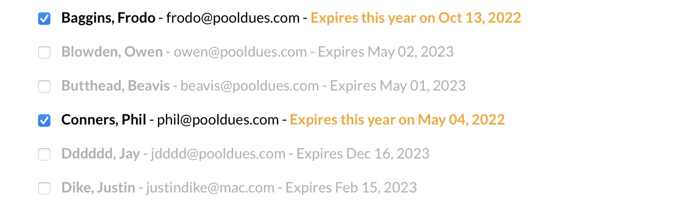 On the next screen, you will select the households to be renewed (only the head of household is listed). Households that have expiration dates in the next calendar year are greyed out as they most likely have already paid (they are still selectable though).