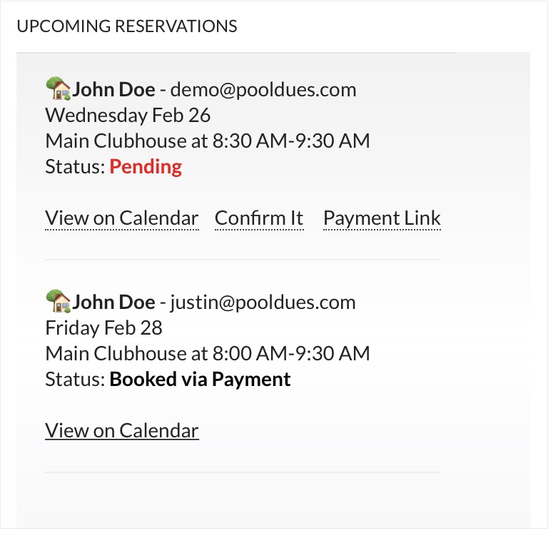 Board Members with the Clubhouse/Facility Manager role are CC-ed on any facility rental product emails, and are notified when a Pending reservation is made.