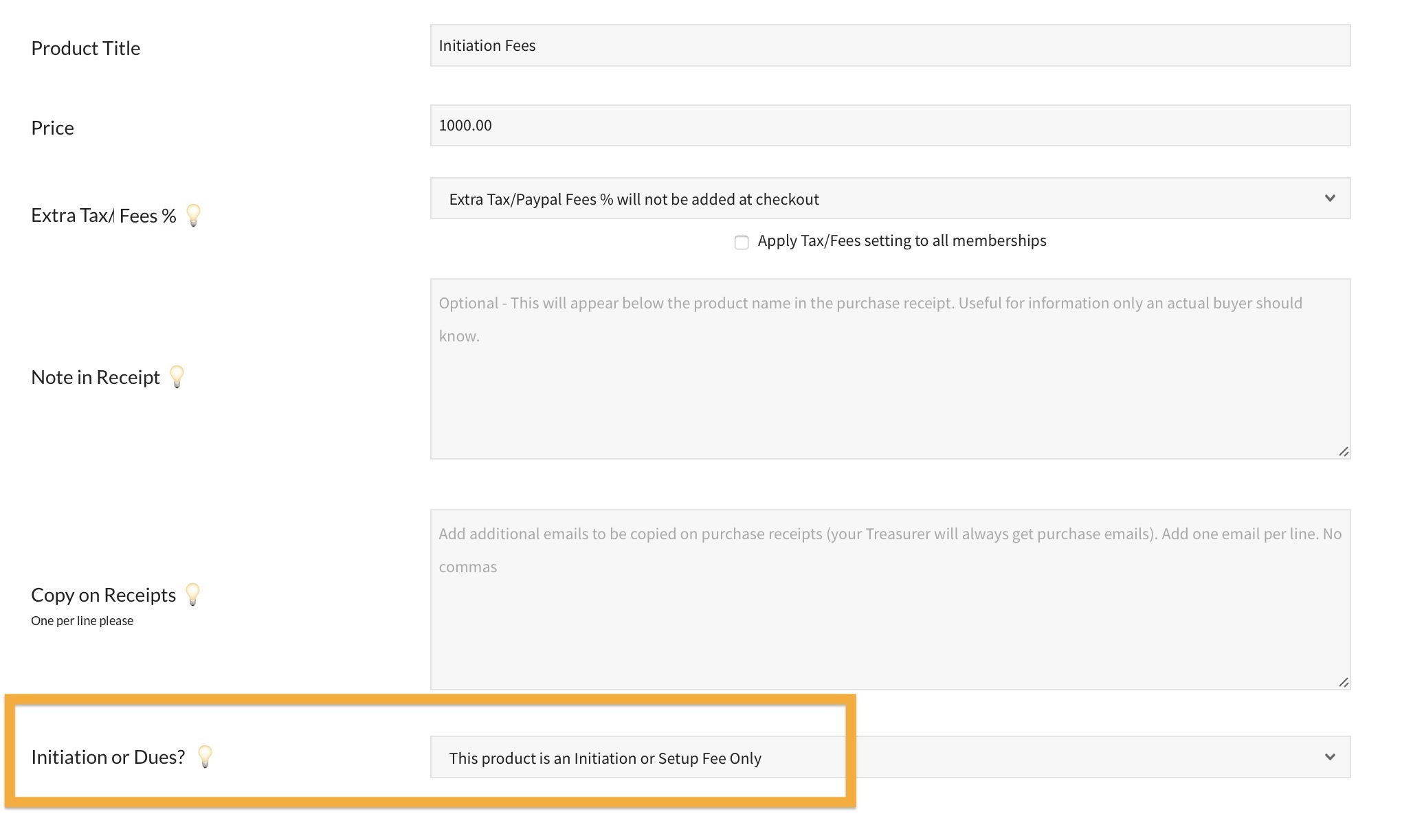 If creating two separate products sounds like the best solution for your club, the Initiation Fee product will be created with the following setting…