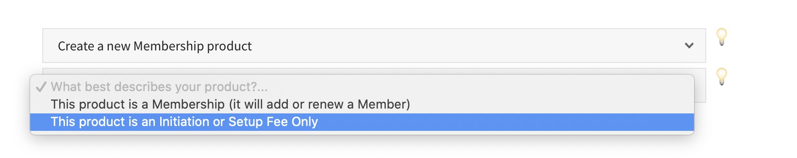 You will notice you have the option at anytime to switch your product back and forth between an Initiation (setup fee )or Dues product (one that actually creates or renews a membership).