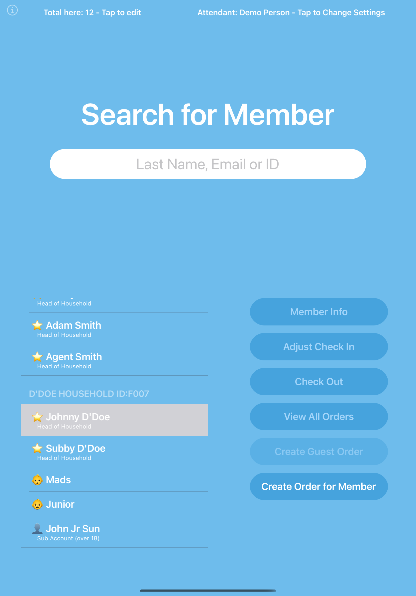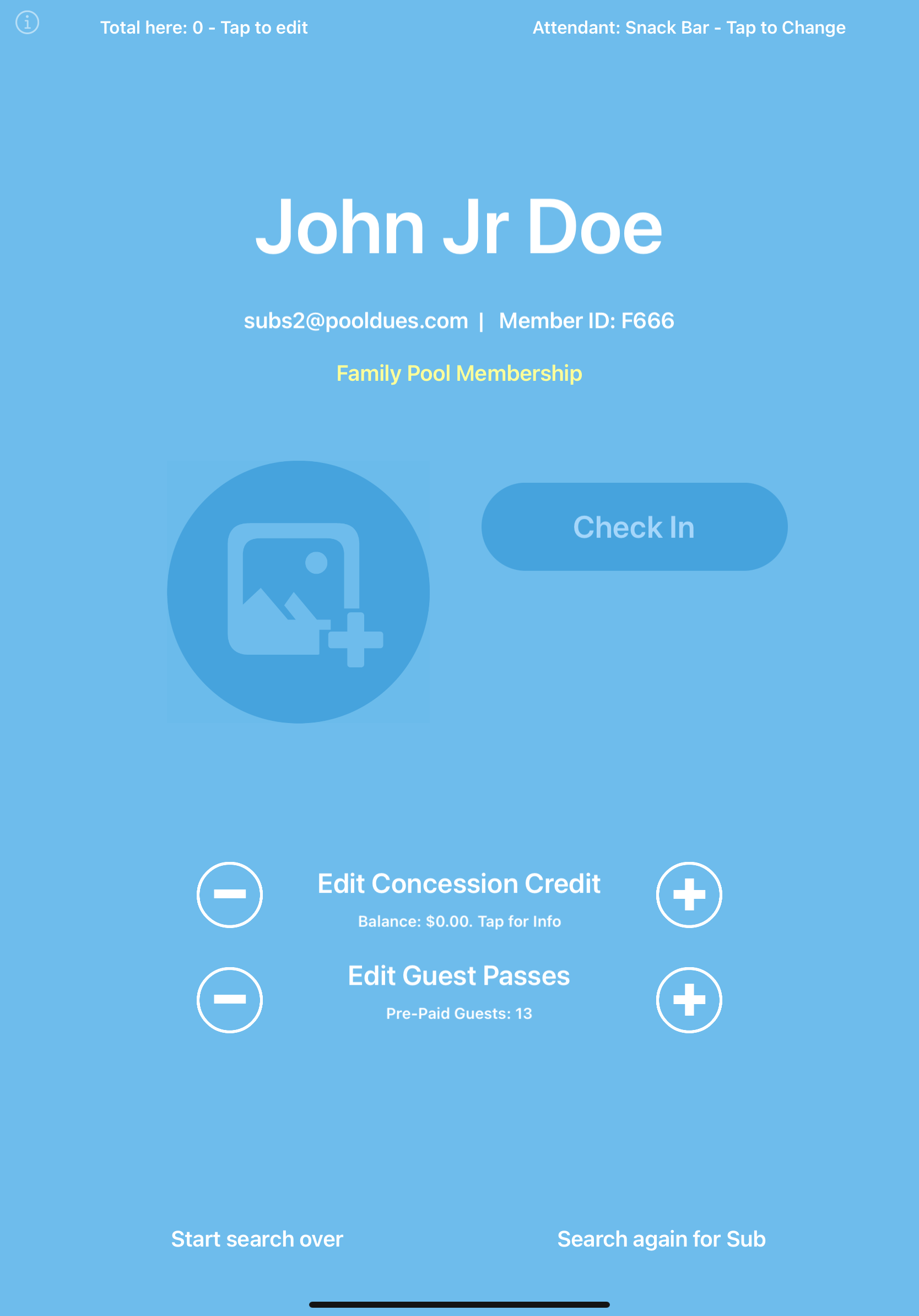 To check members in, all the attendant(s) need to do is search for the member, tap the member’s name, then tap the Check In button. Prior to checking in a member, they can take the member’s / family’s photo (tap the circle with the image / plus icon seen in the screenshot below).