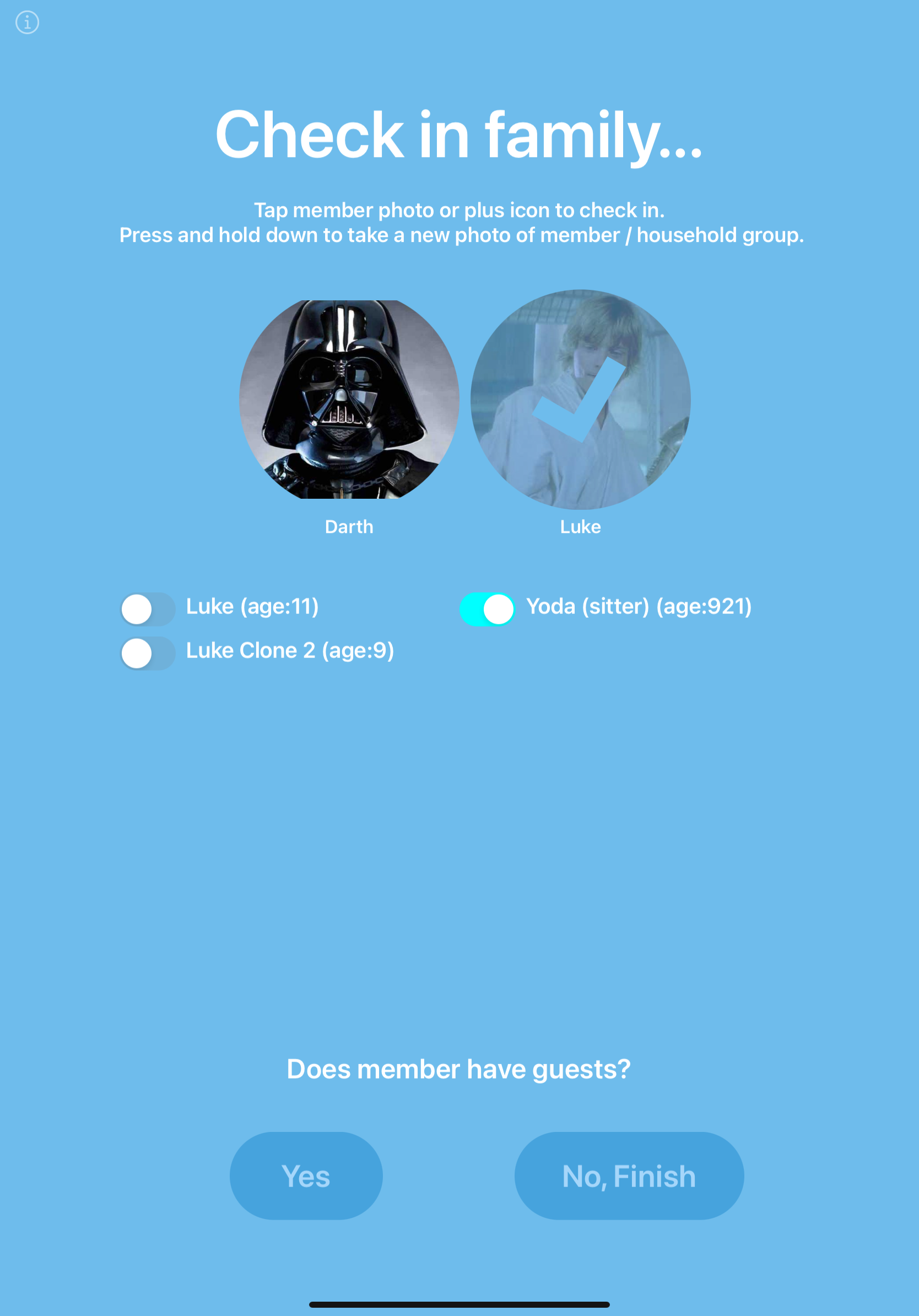 After tapping the Check In button, the attendant must select the members in the household actually coming into the pool. This is done by tapping their photo if it is an account holder, or toggling the switch next to a child or babysitter. In the screenshot below, Luke and Yoda are being checked in.