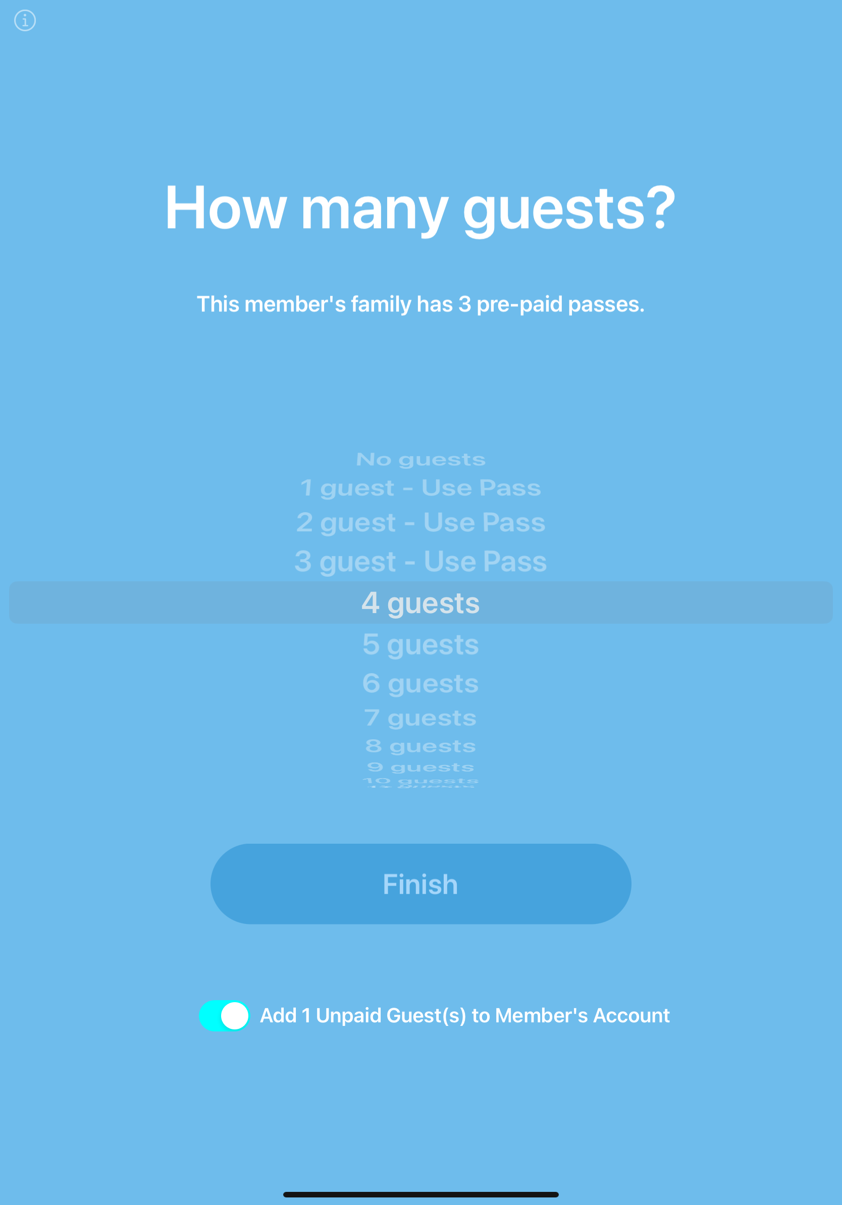 If the number of guests exceeds the number of Pre-Paid Guest passes, a toggle appears below the Finish button. The attendant is given two choices with this toggle.
