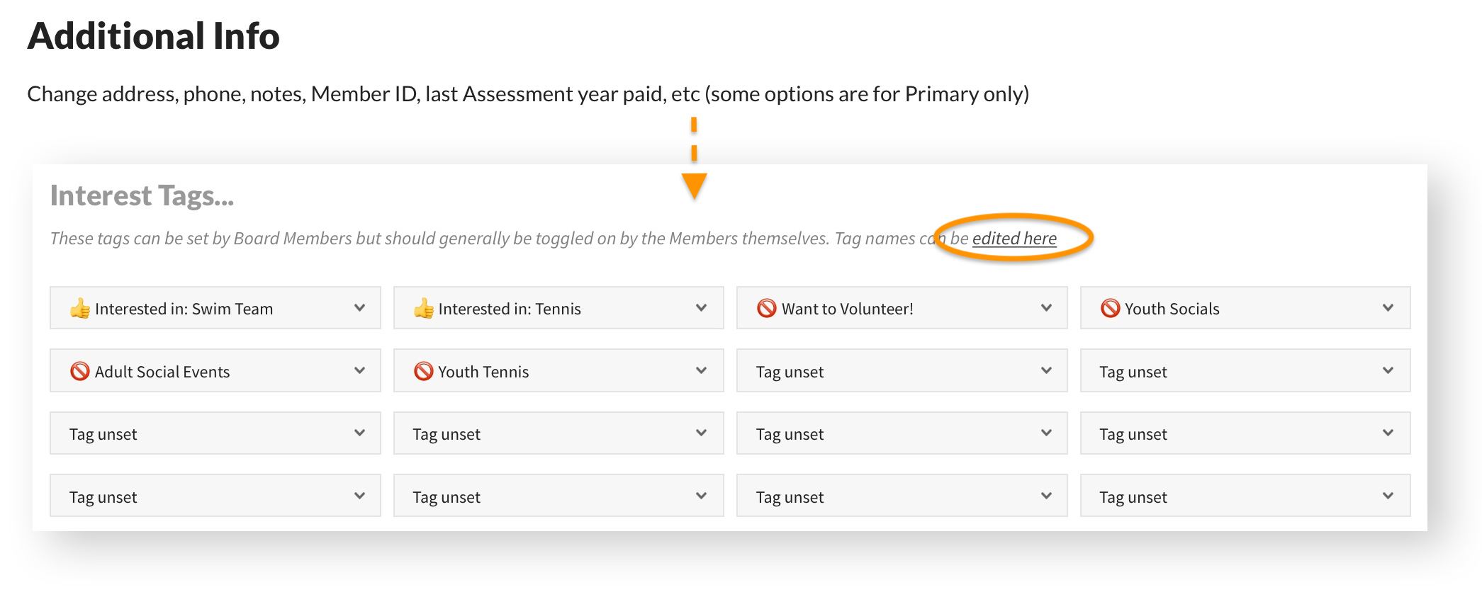 Board members also can set Interest Tags for individual Members in their Member Info. Scroll down and unfold the Additional Info section. The tags that have been set up will be available, including the tags designated for use by Board Members only. (You can also link back to the initial interest tags setup from that page.)