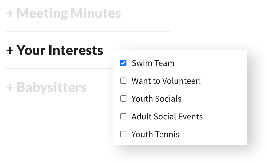 Ideally members will choose their own Interest Tags. From the Member Dashboard, under the Your Interests section, any tags you have set up will be available for selection. You will notice the Tennis option is not available for the member to choose here due to the “for internal use only” setting shown above.