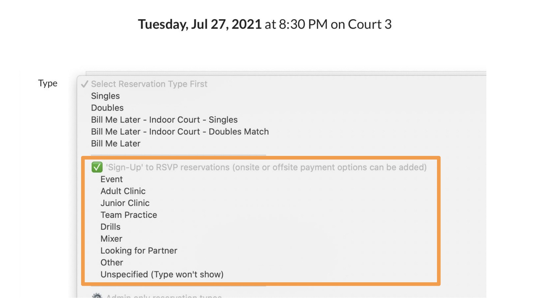 By default your reservation grid will have some example Sign-Up types like Adult Clinic, Junior Clinic, Looking for Partner, etc. These could also include Swim Lessons or Water Aerobics classes that are either free for members or are paid offline. When one of your admins books a reservation they will see these reservation types with the other member-only types and various other admin-only options…